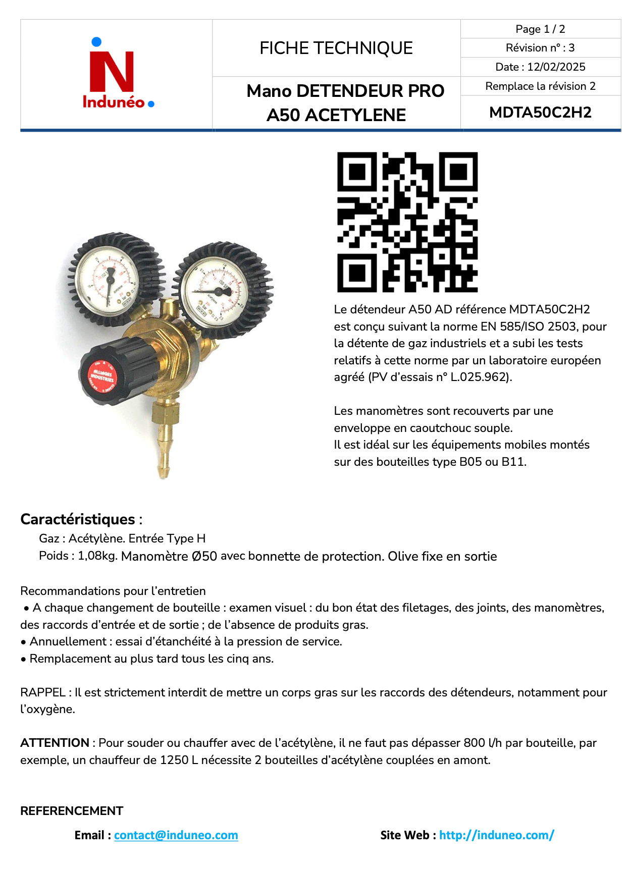 Le manodétendeur A50 Acétylène est conçu conformément à la norme EN 585 / ISO 2503 pour la détente de gaz industriels et a été testé selon ces exigences par un laboratoire européen agréé.